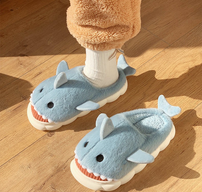 Cotton Slippers for Women Winter Shark Cartoon Cute Fleece Lined Thick Anti-Slip Quiet Indoor Warm Cotton Shoes