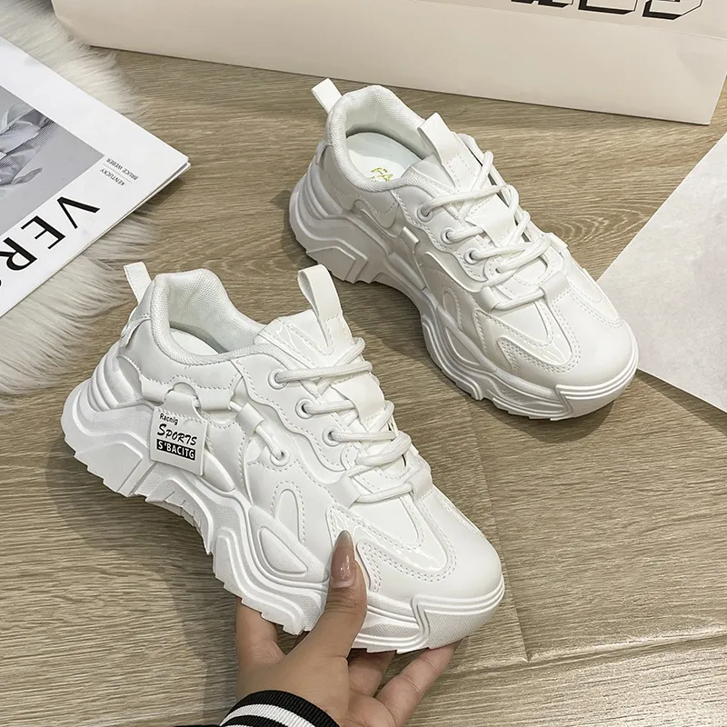 Thick soled women’s white single shoes Korean version color blocked lace up height for casual running